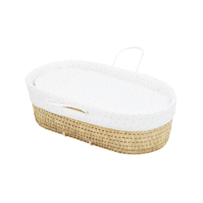 Retour aux sources avec ce panier en feuilles de palmier tressées, évoquant le célèbre « panier de Moïse ». Son design épuré s’habille d’une housse blanche ornée de petites étoiles grises. Le textile, 100% coton, et le matelas assurent le confort de bébé. Deux poignées tressées facilitent les déplacements d’une pièce à l’autre. En option, un support en métal permet de rehausser le couffin. Un compagnon idéal de la naissance jusqu’à environ 6 mois.